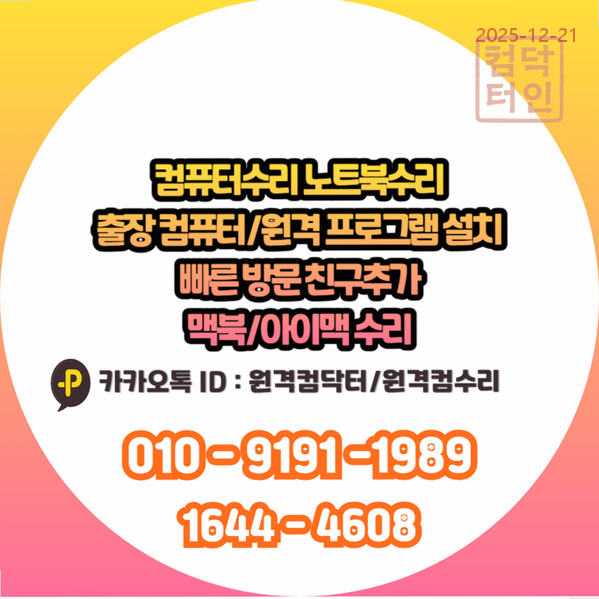 - 💬 카카오톡 문의: 카카오채널 ID '원격컴수리' 또는 '원격컴닥터'